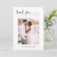 Tack, Romantic Bröllop.. Kort som har ett foto på framsidan och baksidan. Tack-korten innehåller en modern handskriven kursiv skripttypografi som är elegant, enkel och modern till använda efter att du minimalistiskt enkelt bröllopsdag firande.