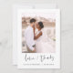Tack, bröllop, ni kort som har ett foto på framsidan och baksidan. Tack-korten innehåller en modern handskriven kursiv skripttypografi som är elegant, enkel och modern till använda efter att du bröllopsdag firande.