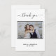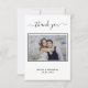 En elegant och ett modernt tackkort, personlig med ditt eget foto. Lägg till fotot, bröllop-datum, namn och tackkort. Ett svartvitt kort med trendig. Texten: Tack på framsidan och namnen på baksidan är skript med snyggt.