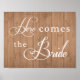 Land chic, rustik och bröllop "Här kommer briden". Underbar för blomflickor och ring. Ta ut träkornen för att få en enkel svart bakgrund, eller leta efter en kritbrädesversion i vår butik. Lägg till en speciell beröring till bröllop, fler bröllop-skyltar i vår butik: http://www.zazzle.co.uk/designbyredline/gifts?cg=196521080171907543