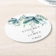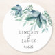 Dessa bröllopsdesignade pappersbrickor visas med ett eukalyptusvintergrön konsttryck.