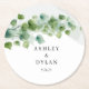 Dessa bröllopspappersunderlägg visas med ett konsttryck med eucalyptusblad.