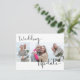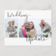 personlig för vykort för bröllop-uppdatering med ditt fotografi och bröllop-uppskjutningsmeddelande. Fotomallen är konfigurerad så att du kan lägga till 3 av dina favoritfoton på framsidan. Dina foton ramas in med "Bröllop Update"-handen i ord, skriven i studenttypografi. Du kan också anpassa vykortets baksida med returadress, anpassningsbar och namn. Ett glädjande och lugnande sätt att uppdatera gästerna och behålla dem i slingan med din ändrade planering.