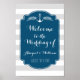 Anpassadet hälsar vår bröllop-skylt välkommen poster med den breda vintagen rand mönster och den klassiska ankaren och blommigten för nautiska fraktaser i mörkens blått, grått och vitt.
