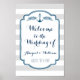 Anpassadet hälsar vår bröllop-skylt välkommen poster med den breda vintagen rand mönster och den klassiska ankaren och blommigten för nautiska fraktaser i mörkens blått, grått och vitt.