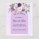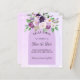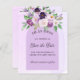 En modern och elegant Spara datum för ett bröllop. Vattenfärgad violett, lavenderbakgrund och en båge ram. Dekorerad med violett och lila blommor. Anpassa och lägg till ett datum och namn. Texten: Spara datumet skrivs med ett stort trendig-handskript i stil. Tillbaka: lägg till URL:en på webbplatsen bröllop för mer information. 1 lakan = 1 Spara datumet som skrivs ut kant till kant.