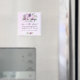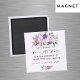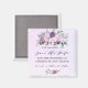 En modern och elegant Spara datum magneter för bröllop. Vattenskärkta violett, lavendelbakgrund, svart text. Dekorerad med violett och lila blommor. Anpassa och lägg till ett datum och namn. Texten: Spara datumet skrivs med ett stort trendig-handskript i stil.