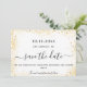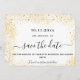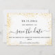 En modern och elegant Spara datum för ett bröllop. Vit bakgrund dekorerad med faux guld glitter. sparkles. Anpassa och lägg till ett datum och namn. Texten: Spara datumet skrivs med ett stort trendig-handskript i stil.