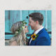 Bröllop-vykort med två foton och tacksam mening. Datum, Namn