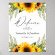Välkommen dina gäster i bröllop med elegantens solrosposter. Utformningen erbjuder en vattenfärgsgrafik av solblommor och grönt som visas över skyltens övre och grund. Anpassa detta välkomnande poster med namn från bruden och brudgummen.