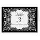 Älskvärt kort för bordsnummer för bröllopmottagande som göras i svartvitt. En utsmyckad barock stilram, i svartvitt, omger vittextområdet. Text är fullständigt anpassadet i stilsortsstil, färger och storleksanpassar.