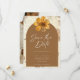 Fånga kärnan i din kärlek-artikel med vårt pressade blomkorgsbröllop spara datumet. Den här fina designen är perfekt för ett fallbröllop, med en elegant som är försedd med delikat pressad blomma i rikens autumnala nyanser. På framsidan visas dina uppgifter om bröllop i ett typsnitt för snyggten, inramat av årstidens botaniska skönhet. På baksidan, lägg till en personlig beröring med ett foto av dig och din partner och skapa ett bestående minne för dina gäster. Oavsett om du planerar en mysigt, rustik firande eller en elegant-affär anger detta Spara datum tonen för en dag fylld med kärlek och naturens fantastiska dag.