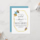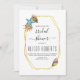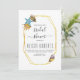 Guldfolie-polygon och sjöhäckar sommarstrandbröllop inbjudningskort för möhippan. Den har ett guld-polygonalt ram med texten och tre vattenfärgssäsonger i beige och blå i det övre lämnat hörnet och en annan i det lämnat grund. Baksidan är av fast blått färg.