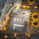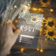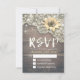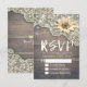 Bröllops-svar Kortmall - Vintage spets, solros och strängljus på rustik trähylla.