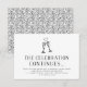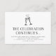 Fortsätt festen! Bröllopsafterfest inbjudan infogningar i chic svart och vitt har "festligheten fortsätter" i svart typografi med dina festdetaljer nedanför, krönt av två illustrerade champagneglas förenade av ett hjärta. Liten storlek gör att kort kan inkluderas med din bröllopsinbjudan eller delas ut på mottagningen. Baksidan av korten har ett botaniskt vin- och knopp-mönster i matchande svart och vitt.
