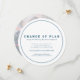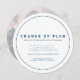 Ändring av plan enkel text klassisk mörkblå och vit kort med ett foto på baksidan. Låt dina gäster veta att ditt bröllop eller annat evenemang har blivit inställt eller uppskjutet på grund av oförutsedda omständigheter.