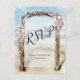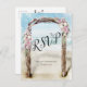 Dessa vykort gör det enkelt för dina gäster att svara på din bröllopsinbjudan. Designen har en vacker akvarellmålning av en drifträdpergola dekorerad med rosa och vita rosor på en orörd strand. Kortet innehåller en svarstid, utrymme för en webbadress så att dina gäster kan svara online om de föredrar det, och en återlämningsbar blankett för dem att ange antalet gäster och deras måltidsval.