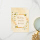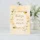 Ett tackkort för en sommar Bröllopsdusch. Gul, vit bakgrund med ett bikakemönster. Med en falsk geometrisk ram i guld. Dekorerad med ljusgula, krämfärgade tropiska blommor, hibiskus och glada humlor. Med texten: Tack och Brud att bli skriven med en modern handskriven stilsnurr. Mall för brudens namn och datumet för duschfirandet. Bruna bokstäver.