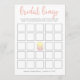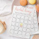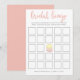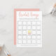 Det klassiska bröllopsbingo spelet på ett vackert kort med en handskriven typsnitt och två läckra franska makaroner i pastellrosa och gul.