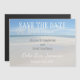 En magnetisk målbröllopsmagnet som kan anpassas helt. Det här spara datum magneter har en vacker strandbotten under lågvatten.