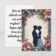 Romantisk silhuett av ett par som kramas, inramad av ett vackert arrangemang av färgglada blommor och blad. Scenen utstrålar en känsla av kärlek och intimitet, markerad av de kontrasterande mörka figurerna mot en mjuk, neutral bakgrund.