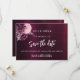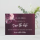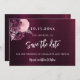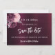 En modern och elegant Spara datum för ett bröllop. En djup burgundisk gradient bakgrund som dekoreras med blommor och faux silverblad. Anpassa och lägg till ett datum och namn. Texten: Spara datumet skrivs med ett stort trendig-handskript i stil.