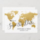 Låt dina gäster veta om ditt romantiska destinationsbröllop datum med detta vackra gyllene världskarta spara datum kort med din anpassade destination markerad med en flyttbar redigerbar hjärta platsmarkör. Flytta hjärtat och skriv in ett nytt stad eller land namn för att helt anpassa denna gyllene världskarta resa tema destinations inbjudan.