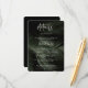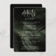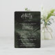 Moody Tropics, bröllopskort med detaljer. Mörk tropisk palmfrondfotografering. Innehåller, vit fet och kantig typografi. Svart bakgrundsfärg.