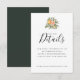 Rustik chic orange lund citrus botanisk, bröllopskort med detaljer. Innehåller apelsin citrusfrukt, fruktträdgårdsgrönska och vit blomsterarrangemang. Malltextrader för din detaljerade information. Bakgrundsfärg i koordinerande mörk jägaregrön.