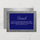 Det här brölloppsdetaljkortet har en minimalistisk, elegant design i chic royalblått, förstärkt med lyxiga glitter silver-ackent. Det enkla kalligrafiska manuset tillför en touch av modern sofistikation och skapar ett raffinerat och stilrent komplement till din speciella dag.