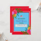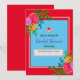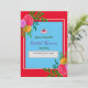 Bilden visar en livfull blå bröllopsdusch-inbjudan mall ramad av en djärv röd kant. Färgglada blomsterarrangemang i nyanser av rosa, orange och gul pryder hörnen. Designen är festlig och lämplig för att tillkännage en speciell tillställning.