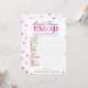 Detta moderna Emoji Pictionary-spel har en rosa magenta bakgrund med metallisk konfetti. Texten är skriven i en blandning av ett lekfullt kalligrafiskt teckensnitt och ett modernt serif-teckensnitt. Detta kort är personligt anpassat med den blivande brudens namn och datum för brudens shower.