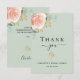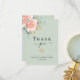 Ett modernt och elegant tackkort för bröllopsdusch. En sagegrön bakgrund. Dekorerad med roségulds- och rosafärgade rosor, blommor och gröna akvarellmålade eukalyptusblad, kvistar, grönska och falska guldkvistar. På framsidan texten: Tack, namn och datum.