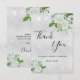 Ett tackkort för bröllopsdusch. En falsk silvermetallisk bakgrundsfärg. Dekorerad med vita blommor, grönska och falskt glitterdamm. På framsidan en stor handskriven skrift och texten: Tack, din text, titel och datum.