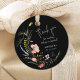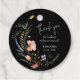Stilrena svarta bröllopsdusch rund favorittaggar med eleganta akvarell wildflowers, tack, ditt namn och dusch datum i chic bokstäver. Matchande artiklar i vår kollektion.