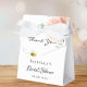 Både klassiskt och sött för en bröllopsfest. Chic vit bakgrund dekorerad med akvarellmålade rosa och roséguld färgade rosor, blommor, eukalyptusgrönska och en glad leende bi. Med texten: Bröllopsfest och Tack skriven med en modern svart handstilsmanus. Personifiera och namnge den blivande bruden och ett datum.