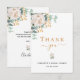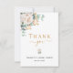 Ett modernt och elegant tackkort för bröllopsfest. En chic vit bakgrund. Dekorerad med en vit blomma, blomma (peony) och gröna akrylmålade eukalyptusblad, kvistar, grönska och en falsk guld kvist. Svarta och gyllene bokstäver. På framsidan texten: Tack, namn och datum.