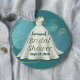 Fira den blivande bruden med denna eleganta knapp "Deep Teal Gold Glitter Wedding Gown", perfekt för hennes bröllopsfest. Designen visar en vacker vit bröllopsklänning prydd med ömtåliga pärlor och gnistrande guldfärgade glitteraccenter, mot en fängslande djup teal akvarellbakgrund. Denna knapp tillför en touch av sofistikering och glamour till alla bröllopsfestdekorationer eller partygåvor. Det är ett underbart sätt att fira hennes speciella dag, med utrymme för hennes namn och evenemangets datum elegant visade. Gör hennes bröllopsfest oförglömlig med denna fantastiska och chic souvenir.