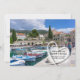 Perfekt inbjudan för par som gifter sig i Kroatien och vill fira sitt bröllop med vänner och familj hemma när de återvänder. Vacker båt i hamn och blå himmel foto bild och virvlar i form av ett hjärta