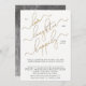 Denna vackra, moderna svarta, vita och gyllene bröllopsinbjudan efter vigseln "Happily Ever After" har en förgylld blad-kalligrafisk skrift som lyder "To Love, Laughter, and Happily Ever After" som huvudsaklig designelement. Designen är personlig med er bröllopsannons nedan, följt av detaljer om inbjudan till efterfesten. Designen kompletteras vackert med det moderna, versala sans serif-teckensnittet i svart, på den krispiga, vita bakgrunden, som kungör datum och plats för efterfesten. Baksidan av inbjudan har en modern svart-vit akvarell-konst för att fullborda den sofistikerade designen.