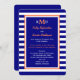 Denna randiga bröllopsinbjudan efter vigseln har ett marint tema med marinblå och vita ränder i bakgrunden. Era inbjudningsdetaljer visas på marinblå som kantas med vitt och korall. Ni kan placera er monogram högst upp och ange detaljerna om var ni vigdes, samt ange detaljerna för er bröllopsfest efter vigseln. Copyright henishouseofpaper