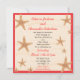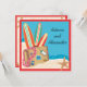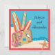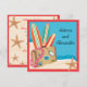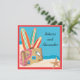 Gift er i det tysta och vill nu fira er vigsel med vänner och familj? Då kan detta vara något. Resväskor med resdekaler, lei och surfbrädor på en sandstrand och baksidan för din festinformation med utspridda sjöstjärnor. Ljust och färgglatt för en rolig strandfest efter bröllop eller destination bröllopsfest. Handritad illustration av McBooboo.