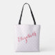 Vackra, ljusa rosa hjärtan, elegant svart på vitt typografiskt skript, rött hjärta, snyggt, trendig, anpassningsbar, personlig, tote bag for the bride for möhippa, bachelorette Party, bröllop. På andra sidan har säcken namn i ett vackert skrivmanus för rosa av elegant. Skriv helt enkelt namn för bruden om du vill anpassa den.