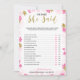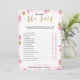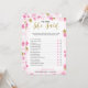 Ett delikat modernt blomsterbröllopsfest "Han sa hon sa"-spel, designen har ett rosa och guld blomstermönster, detta kort är personligt med brudens namn och datum för festen.