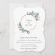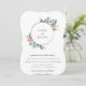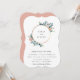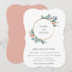Vacker akvarell trädgårdslövverk och ömtåliga blommor på guldring ram, bröllopsinbjudan. Baksidan av kortet har en solid roséguldskimrande rosa färg.