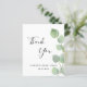 Ett tackkort för en Bröllopsfest. En chic vit bakgrund dekorerad med eucalyptus grönska. På framsidan stor svart färgad handskriven text och texten: Tack, er och ett datum. Baksida: Personlig och lägg till Din tacktext och namn.
