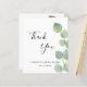 Ett tackkort för en Bröllopsfest. En chic vit bakgrund dekorerad med eukalyptus grönska. På framsidan stor svart färgad handskriven skrift och texten: Tack, du och ett datum. Baksida: Anpassa och lägg till Din tacknota och namn.