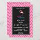 En bröllopsinbjudan med en grafisk illustration av en rosa flamingo. Texten säger: Flockar fantastiskt. Bakgrundsmönstret är ett rosa och vitt handritat chevronmönster.