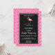 En bröllopsinbjudan med en grafisk illustration av en rosa flamingo. Texten säger: Flockande fantastiskt. Bakgrundsmönstret är ett rosa och vitt handritat chevronmönster.