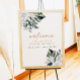 Denna välkomstskylt till bröllopsfesten har rosa pampas, tropiska palmkvistar och ett roligt handskrivet typsnitt. Denna affisch för bröllopsfesten är perfekt för din strand- eller tropiskt inspirerade bröllopsfest.
